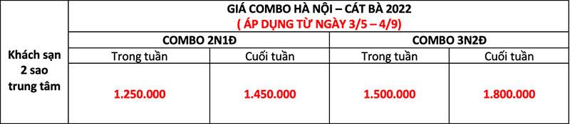 Quý khách vui lòng xem giá gói Combo du lịch Cát Bà 2 ngày 1 đêm và gói Combo du lịch Cát Bà 3 ngày 2 đêm chi tiết dưới đây: